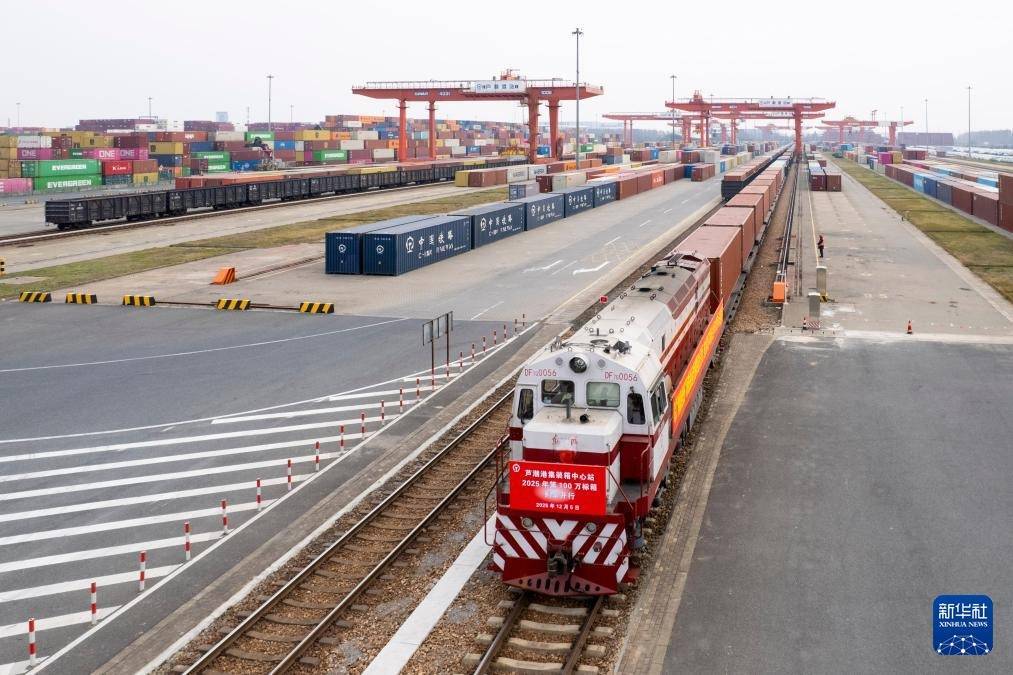 r12月5日,一回载有太阳能光伏组件、汽车零配件等货色的海铁联运班列从上海芦潮港集装箱中心站开出,标记着2025年以来上海海铁联运业务量冲破100万标箱,同比增长近两成,创历史新高。