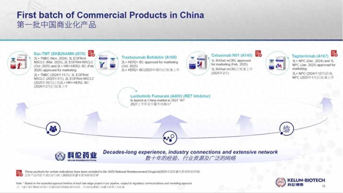 科伦博泰的第一波管线,由5款颇具竞争力的贸易化居品构成,包括具有Best-in-Class后劲的TROP2 ADC 芦康沙妥珠单抗(佳泰莱®);首个头敌人T-DM1拯救2L+ HER2+乳腺癌胜出的国产HER2 ADC博度曲妥珠单抗(舒泰莱®);首个获批拯救一线鼻咽癌的PD-L1单抗塔戈利单抗(科泰莱®),以及与原研药爱必妥®具有临床等效性的西妥昔单抗N01(达泰莱®);另有一款拯救1L+ RET+非小细胞肺癌的RET扼制剂富马酸仑博替尼(宁泰莱®)预测在一年傍边获批。