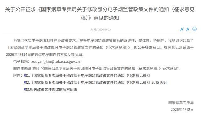 4月2日,为贯彻落实电子烟为止性产业计谋要求,进步电子烟监管计谋的统筹性和调和性,国度香烟专卖局组织草拟了《国度香烟专卖局对于修改部分电子烟监管计谋文献的奉告(征求见识稿)》,对《对于促进电子烟产业法治化范例化的几许计谋步调(试行)》《电子烟固定金钱投资责罚确定》《电子烟产物手艺审评引申确定》《电子烟产物回顾责罚确定》《电子烟相差口生意和对外经济手艺联结责罚确定》《电子烟有关分娩企业训诫、分立、统一、破除责罚确定》《国度香烟专卖局办公室对于印发规范的奉告》等7部电子烟监管计谋文献的部分条目进行修改。